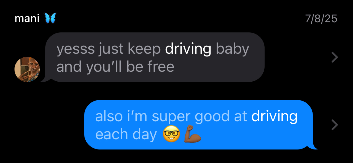 Every time I went to drive, I would text my friends or give them updates to feel better if I was scared… they got to experience with me even though they weren’t in the car… would I have felt the confidence without their support and mini-check-ins… How much longer would it have taken me to explore the world beyond my house without their help? What do you text, call, or FaceTime your tribe, especially long-distance peeps, when you need some courage? Or so they can experience something with you?